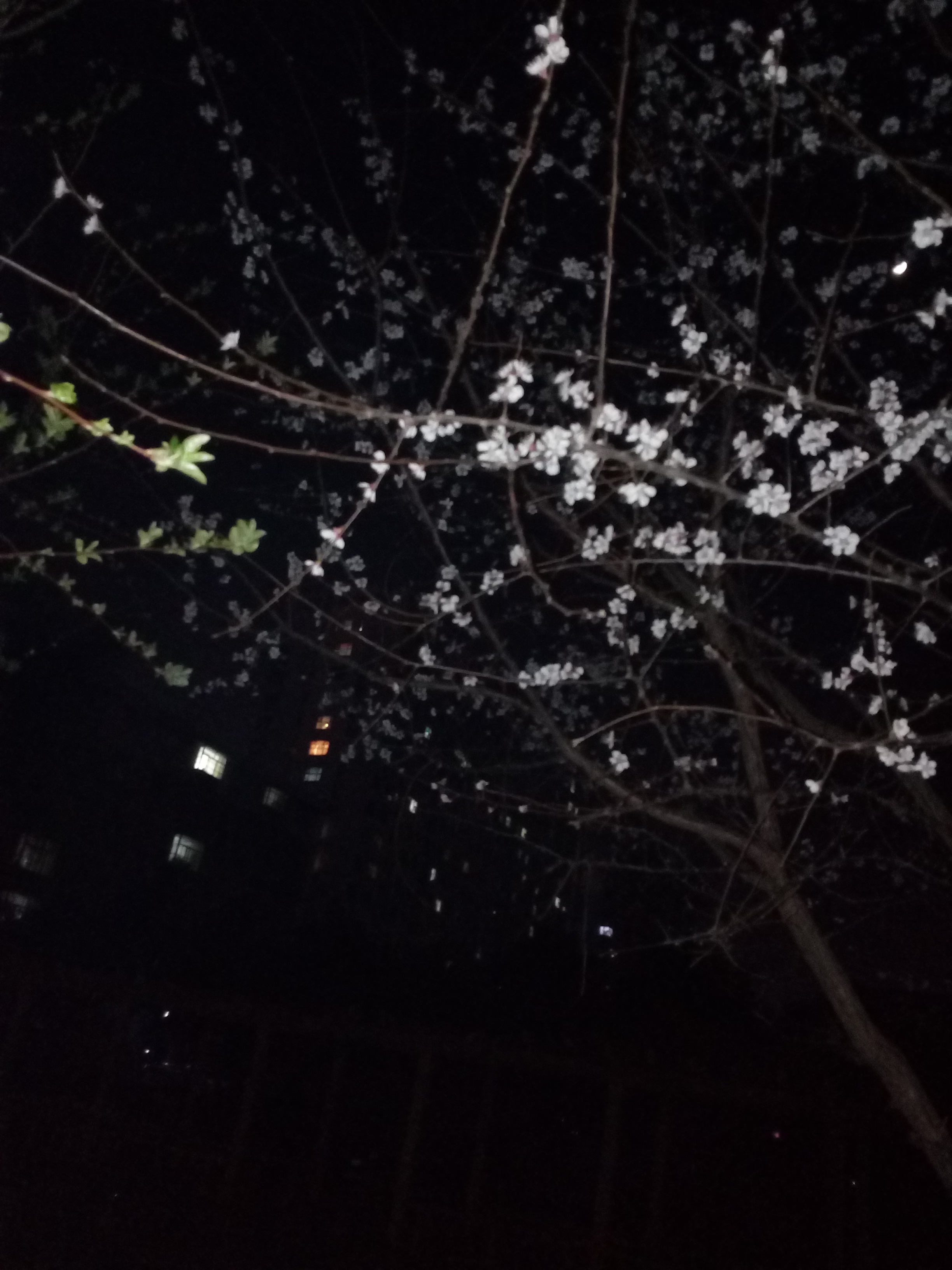注:散步于楼前花园小径,灯光恰照眼前头上花满几树,想起白天窗外鸟鸣悦人,正怡然悦赏,忽更见花枝间一轮明月,顿诗兴油然而生,得此诗。